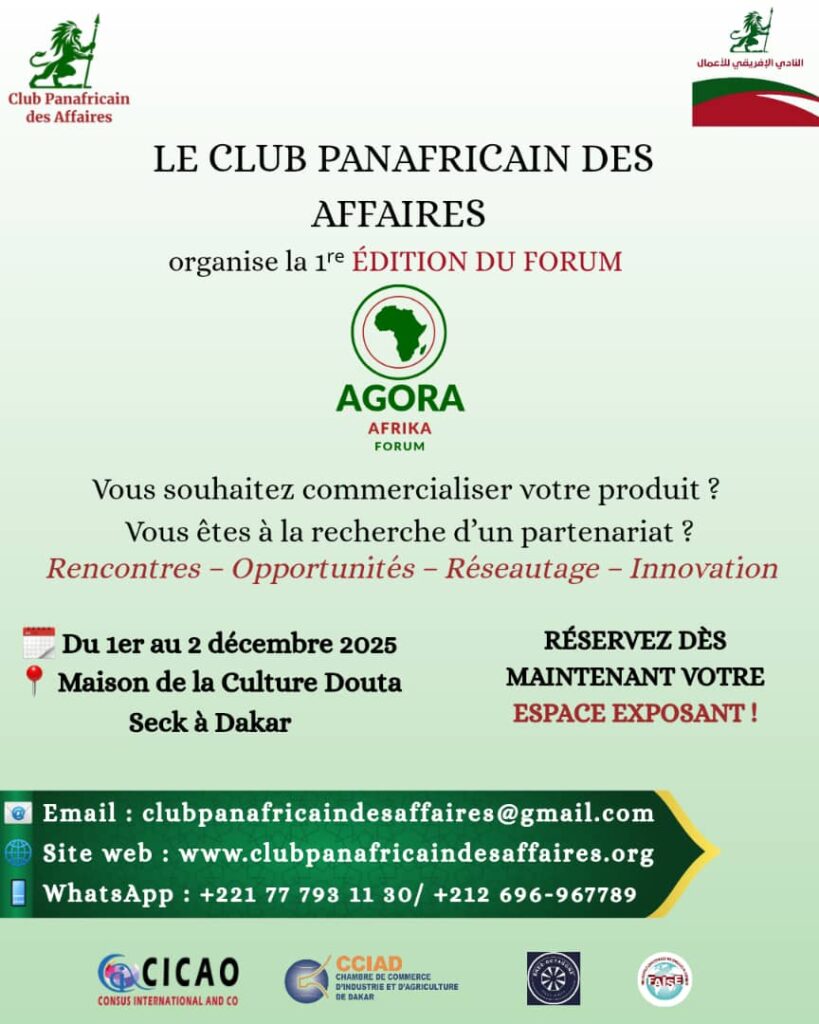 Le Club Panafricain des Affaires (CP2A) en partenariat avec le Cabinet Consus International (CICAO), le bureau des études stratégiques Bres-Octagone et l’accompagnement institutionnel de la Chambre du Commerce International de Dakar (CCIAD) et le Fonds d’Appui à l’Investissement des Sénégalais de l’Extérieur (FAISE), organise le AGORA AFRIKA FORUM prévu du 1er au 4 Décembre 2025 à Dakar, sous le thème : « Relancer le commerce intracommunautaire africain par les critères de mise en œuvre de la ZLECAf » .